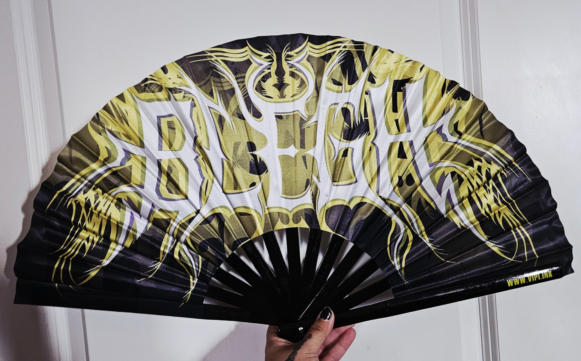 If you hold this fan to your ear, do you hear the mosh pit calling? Perfect for showing you're ready for the breakdown! Made of strong and flexible bamboo ribs, this clack fan is ready to heckin' GO. Keep yourself (and those around you) cool in between bangers, and keep the fan handy with the included carrying bag.